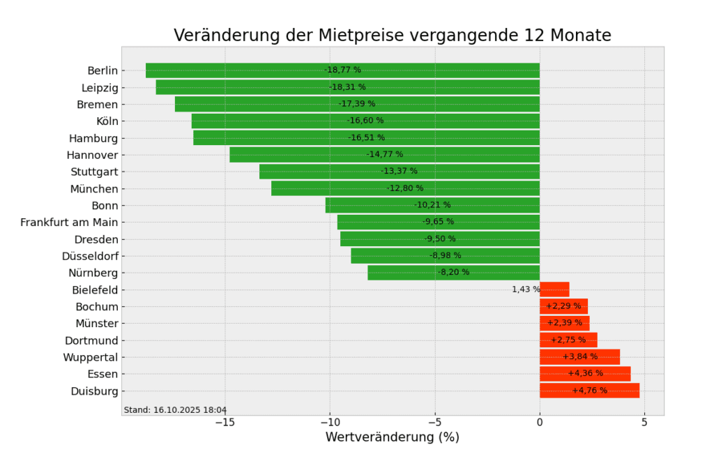 Seit vorherigem Jahr sind die Mietpreise für Suchende am meisten in Duisburg, Essen und Wuppertal gestiegen. Man zahlt in Duisburg mit durchschnittlich 8,66 Euro/m² momentan etwa 4,76% mehr als in der Vorjahreswoche, in Essen rund 4,36% mehr (10,17 Euro/m²) und in Wuppertal circa 3,84% mehr (9,33 Euro/m²). Schaut man nach Berlin, Leipzig und Bremen so kann man feststellen, dass hier die Mietpreise hier am stärksten zurückgegangen sind. Hier zahlt man nun durchschnittlich 17,39 bis 18,77 Prozent weniger als noch vor einem Jahr.