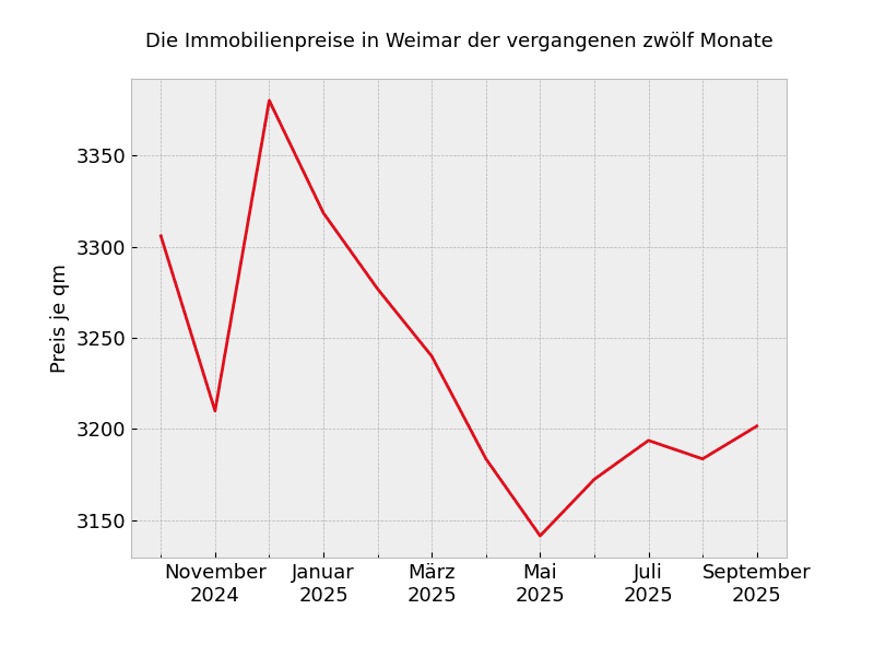 Mit 3.430 Euro pro Quadratmeter muss rechnen, wer zur Zeit nach einer Immobilien in Weimar sucht. Dies sind -2,4 Prozent weniger als noch vor einem Jahr.
