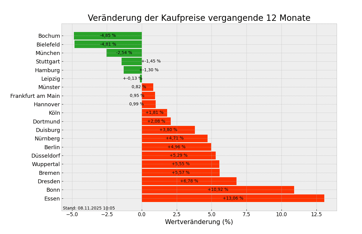 Weiter steigende Angebotspreise werden in 14 der 20 größten deutschen Städte registriert, im Durchschnitt geht es um 2,20 Prozent nach oben. Gegen den allgemeinen Trend verbilligten sich nur die Immobilien in unter anderem Bochum, Bielefeld und München, die Preise sanken hier um 2,54 bis 4,85 Prozent. Drei Städte stehen diese Woche an der Spitze, was die Steigerung bei den Immobilienpreisen angeht. Auf dem ersten Platz ist Essen mit aktuell 3373,38 Euro/m² (+13,06%), gefolgt von Bonn 4856,87 Euro/m² (+10,92%) und Dresden auf dem dritten Platz mit 3795,84 Euro/m² (+6,78%).
