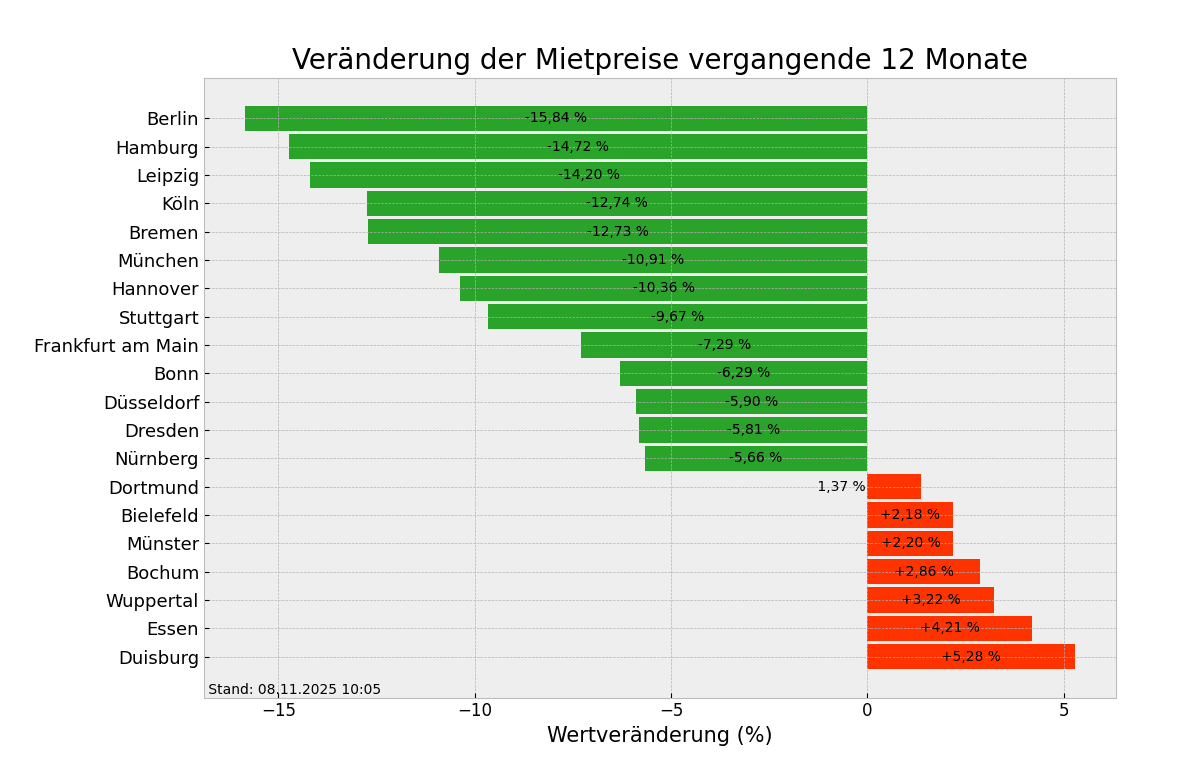 Seit vorherigem Jahr sind die Mietpreise für Suchende am meisten in Duisburg, Essen und Wuppertal gestiegen. Man zahlt in Duisburg mit durchschnittlich 8,76 Euro/m² momentan etwa 5,28% mehr als in der Vorjahreswoche, in Essen rund 4,21% mehr (10,16 Euro/m²) und in Wuppertal circa 3,22% mehr (9,33 Euro/m²). Schaut man nach Berlin, Hamburg und Leipzig so kann man feststellen, dass hier die Mietpreise hier am stärksten zurückgegangen sind. Hier zahlt man nun durchschnittlich 14,20 bis 15,84 Prozent weniger als noch vor einem Jahr.