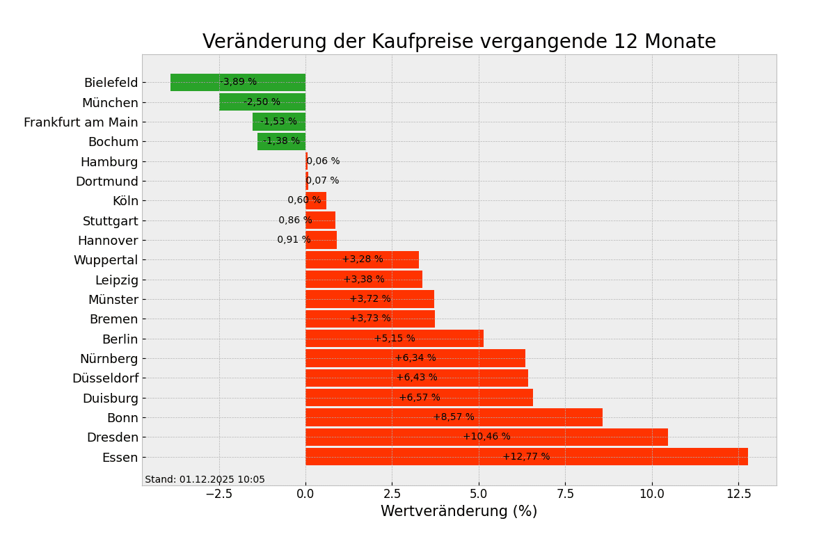 Weiter steigende Angebotspreise werden in 16 der 20 größten deutschen Städte registriert, im Durchschnitt geht es um 2,71 Prozent nach oben. Gegen den allgemeinen Trend verbilligten sich nur die Immobilien in unter anderem Bielefeld, München und Frankfurt am Main, die Preise sanken hier um 1,53 bis 3,89 Prozent. Drei Städte stehen diese Woche an der Spitze, was die Steigerung bei den Immobilienpreisen angeht. Auf dem ersten Platz ist Essen mit aktuell 3361,25 Euro/m² (+12,77%), gefolgt von Dresden 3874,61 Euro/m² (+10,46%) und Bonn auf dem dritten Platz mit 4784,33 Euro/m² (+8,57%).