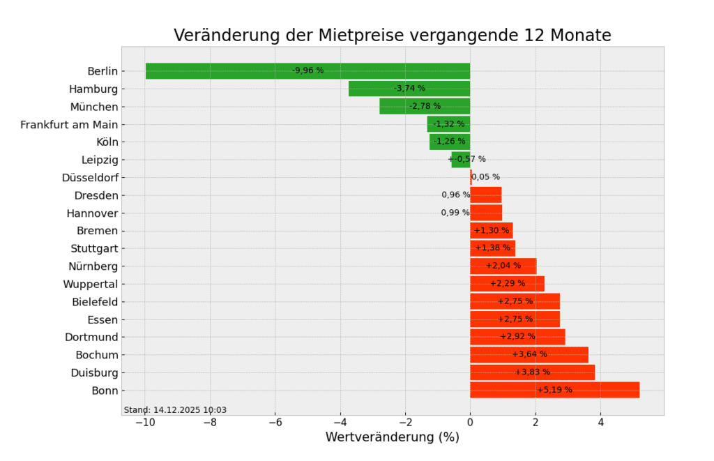 Seit vorherigem Jahr sind die Mietpreise für Suchende am meisten in Bonn, Duisburg und Bochum gestiegen. Man zahlt in Bonn mit durchschnittlich 14,36 Euro/m² momentan etwa 5,19% mehr als in der Vorjahreswoche, in Duisburg rund 3,83% mehr (8,84 Euro/m²) und in Bochum circa 3,64% mehr (9,88 Euro/m²). Schaut man nach Berlin, Hamburg und München so kann man feststellen, dass hier die Mietpreise hier am stärksten zurückgegangen sind. Hier zahlt man nun durchschnittlich 2,78 bis 9,96 Prozent weniger als noch vor einem Jahr.