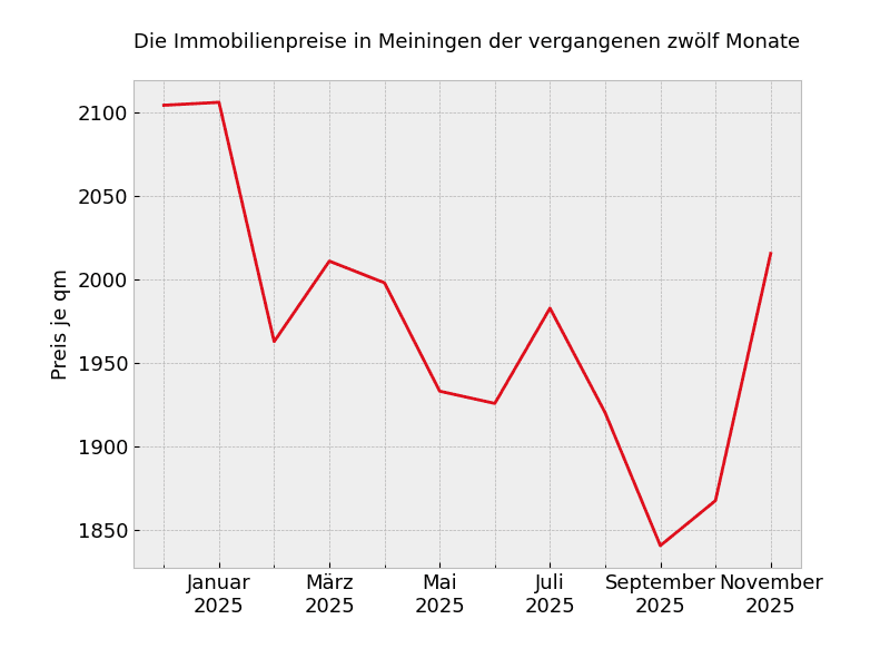 Mit 1.685 Euro pro Quadratmeter muss rechnen, wer zur Zeit nach einer Immobilien in Meiningen sucht. Dies sind 8,6 Prozent mehr als noch vor einem Jahr.