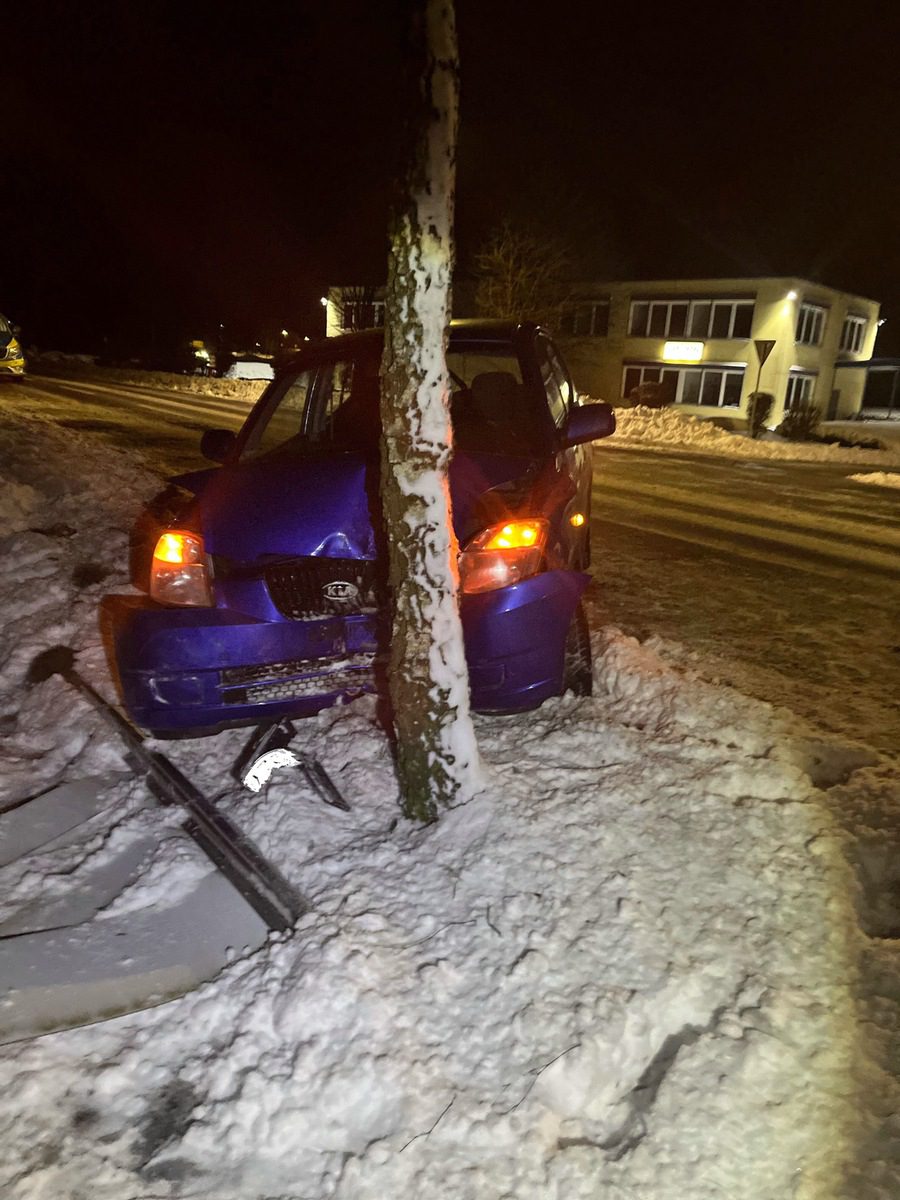 Ein 21-Jähriger aus Marienheide fuhr am Sonntag mit seinem Kia auf der Müllenbacher Straße in Richtung Rodt. Gegen 21:25 Uhr geriet er aufgrund der winterglatten Fahrbahn nach rechts von der Straße ab, kollidierte zunächst mit einem Industrieschild und stieß anschließend gegen einen Baum.