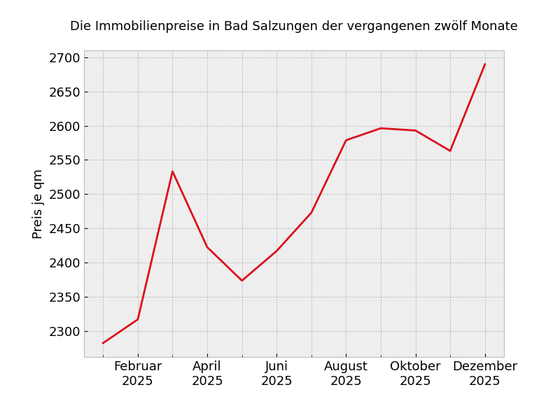 In Bad Salzungen werden Immobilien kaum noch teurer. Dies ergibt eine Auswertung für mehr als 90% der Angebotsmieten und Angebotspreise in dieser Woche. In dieser Woche müssen 2.591 Euro pro Quadratmeter bezahlt werden, das ist eine Änderung von minus -0,2 Prozent im Vergleich zum Vorjahr.