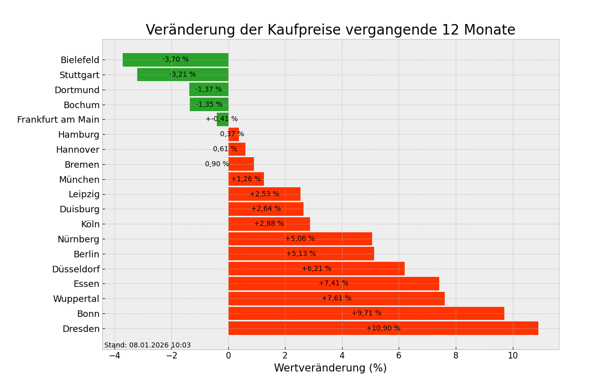 Um stolze 2,58 Prozent sind die Quadratmeterpreise seit der Vorjahreswoche geklettert, in immerhin 14 von 19 Städten. Einige Ausnahmen sind Bielefeld, Stuttgart und Dortmund, dort gaben die Preise leicht nach, jeweils um 1,37 bis 3,70 Prozent. In Dresden, Bonn und Wuppertal hingegen sind die Immobilienpreise am stärksten gestiegen. Man zahlt in Dresden momentan durchschnittlich 3934,12 Euro/m² (+10,90%), in Bonn 4871,36 Euro/m² (+9,71%) und in Wuppertal 2597,25 Euro/m² (+7,61%).
