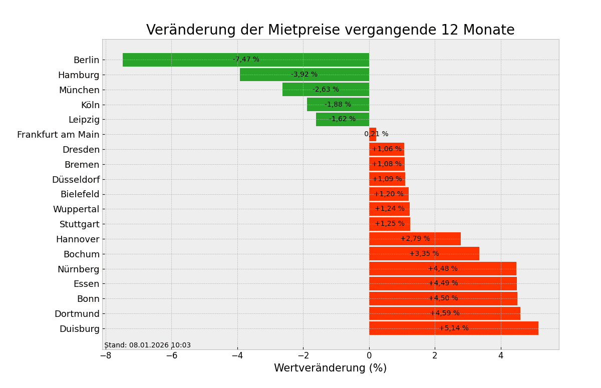 Seit vorherigem Jahr sind die Mietpreise für Suchende am meisten in Duisburg, Dortmund und Bonn gestiegen. Man zahlt in Duisburg mit durchschnittlich 9,02 Euro/m² momentan etwa 5,14% mehr als in der Vorjahreswoche, in Dortmund rund 4,59% mehr (10,53 Euro/m²) und in Bonn circa 4,50% mehr (14,42 Euro/m²). Schaut man nach Berlin, Hamburg und München so kann man feststellen, dass hier die Mietpreise hier am stärksten zurückgegangen sind. Hier zahlt man nun durchschnittlich 2,63 bis 7,47 Prozent weniger als noch vor einem Jahr.