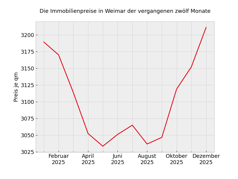 Mit 3.488 Euro pro Quadratmeter muss rechnen, wer zur Zeit nach einer Immobilien in Weimar sucht. Dies sind -6,2 Prozent weniger als noch vor einem Jahr.