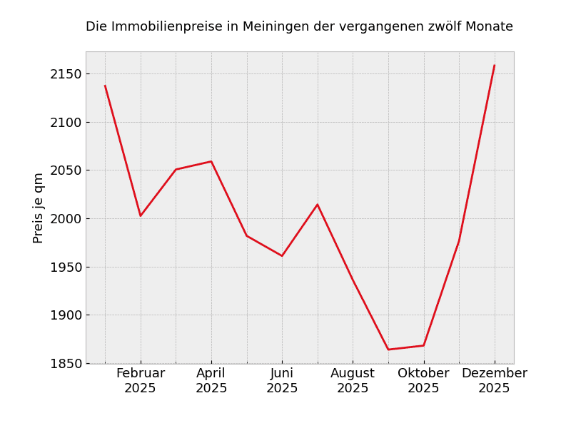 Mit 2.021 Euro pro Quadratmeter muss rechnen, wer zur Zeit nach einer Immobilien in Meiningen sucht. Dies sind 25,4 Prozent mehr als noch vor einem Jahr.