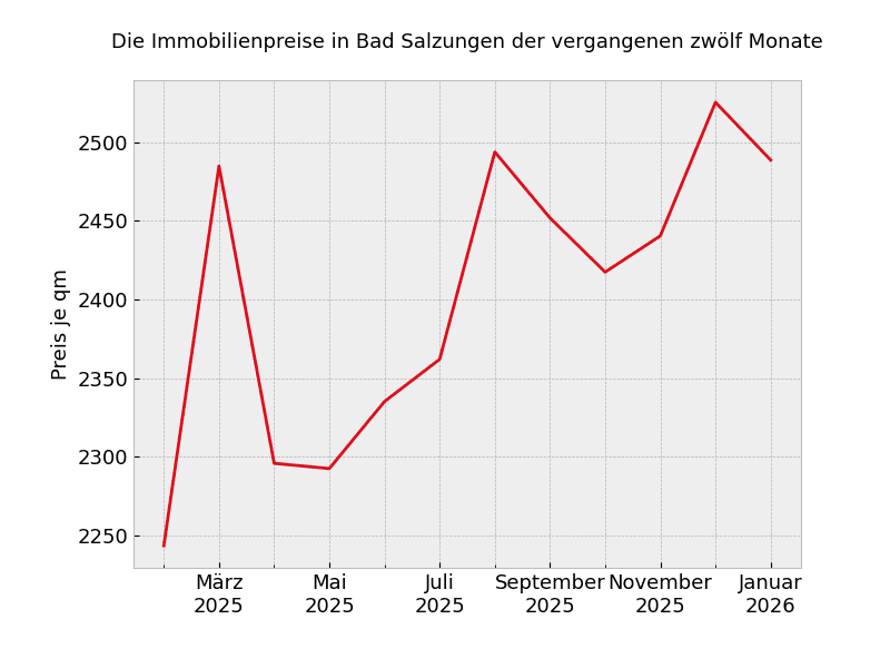 2.647 Euro: So viel kostet der Quadratmeter zur Zeit für Immobilien über alle Kategorien und Größen hinweg in Bad Salzungen und damit 49,7 Prozent mehr als vor 12 Monaten.