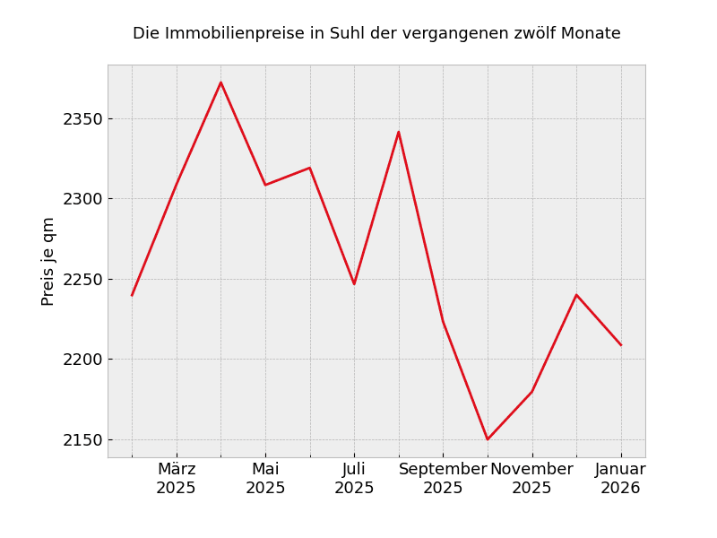 2.007 Euro: So viel kostet der Quadratmeter zur Zeit für Immobilien über alle Kategorien und Größen hinweg in Suhl und damit 14,3 Prozent mehr als vor 12 Monaten.