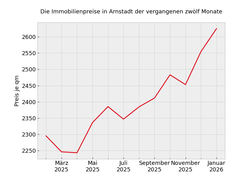 2.111 Euro: So viel kostet der Quadratmeter zur Zeit für Immobilien über alle Kategorien und Größen hinweg in Arnstadt und damit 16,2 Prozent mehr als vor 12 Monaten.
