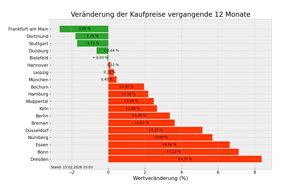 Um stolze 2,15 Prozent sind die Quadratmeterpreise seit der Vorjahreswoche geklettert, in immerhin 14 von 19 Städten. Einige Ausnahmen sind lediglich die Städte Frankfurt am Main, Dortmund und Stuttgart, dort gingen die Preise im Vergleich zur Vorjahreswoche um 1,71 bis 2,65 Prozent nach unten. In Dresden, Bonn und Essen hingegen sind die Immobilienpreise am stärksten gestiegen. Man zahlt in Dresden momentan durchschnittlich 4000,07 Euro/m² (+8,37%), in Bonn 4723,34 Euro/m² (+7,13%) und in Essen 3142,56 Euro/m² (+6,64%).