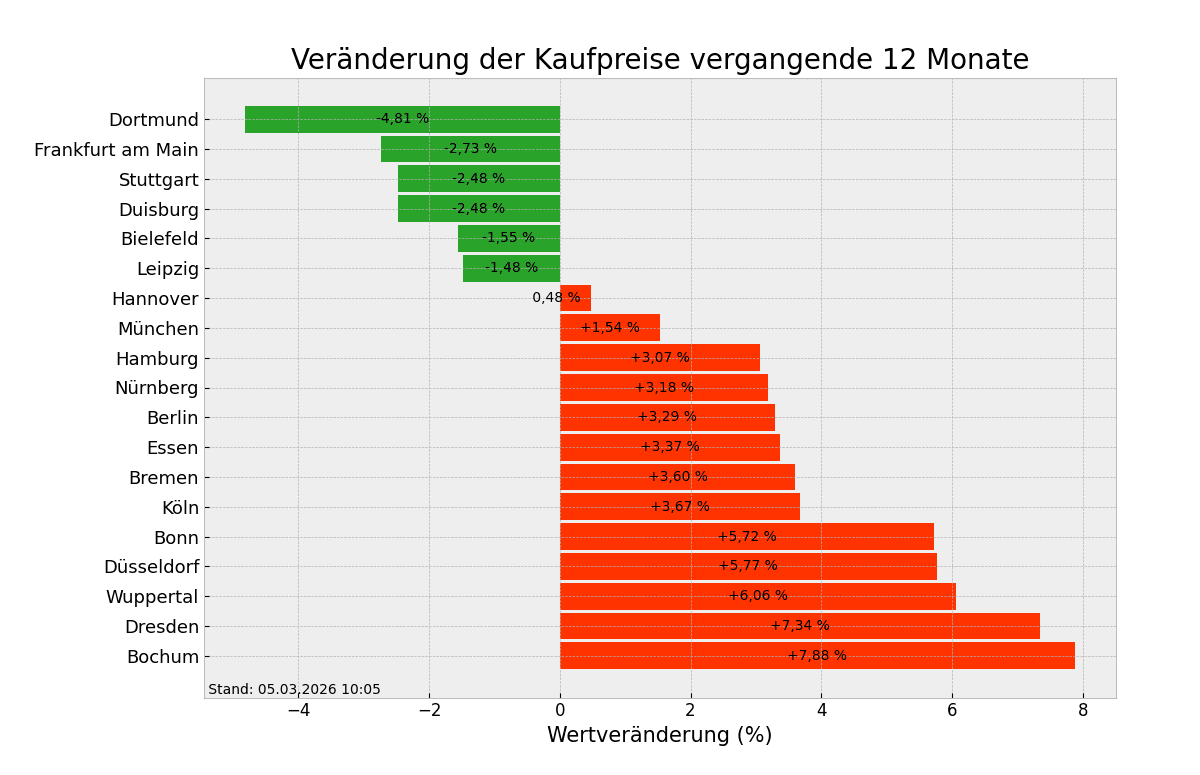 In 13 von 19 Städten sind die Quadratmeterpreise weiter gestiegen, durchschnittlich um 1,97 Prozent. Gegen den allgemeinen Trend verbilligten sich nur die Immobilien in unter anderem Dortmund, Frankfurt am Main und Stuttgart, die Preise sanken hier um 2,48 bis 4,81 Prozent. In Bochum, Dresden und Wuppertal hingegen sind die Immobilienpreise am stärksten gestiegen. Man zahlt in Bochum momentan durchschnittlich 3037,03 Euro/m² (+7,88%), in Dresden 4068,46 Euro/m² (+7,34%) und in Wuppertal 2560,64 Euro/m² (+6,06%).
