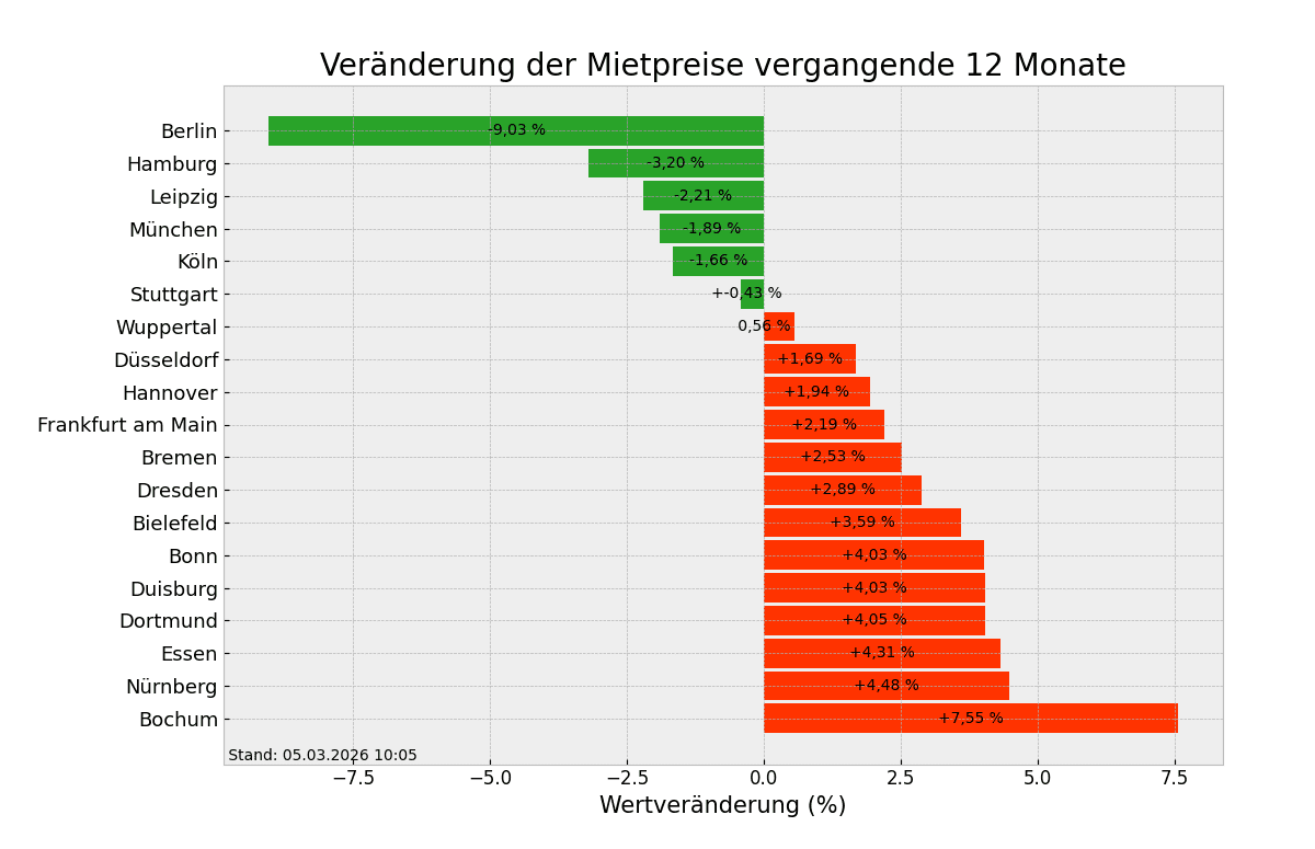 Seit vorherigem Jahr sind die Mietpreise für Suchende am meisten in Bochum, Nürnberg und Essen gestiegen. Man zahlt in Bochum mit durchschnittlich 9,94 Euro/m² momentan etwa 7,55% mehr als in der Vorjahreswoche, in Nürnberg rund 4,48% mehr (14,44 Euro/m²) und in Essen circa 4,31% mehr (10,26 Euro/m²). Schaut man nach Berlin, Hamburg und Leipzig so kann man feststellen, dass hier die Mietpreise hier am stärksten zurückgegangen sind. Hier zahlt man nun durchschnittlich 2,21 bis 9,03 Prozent weniger als noch vor einem Jahr.