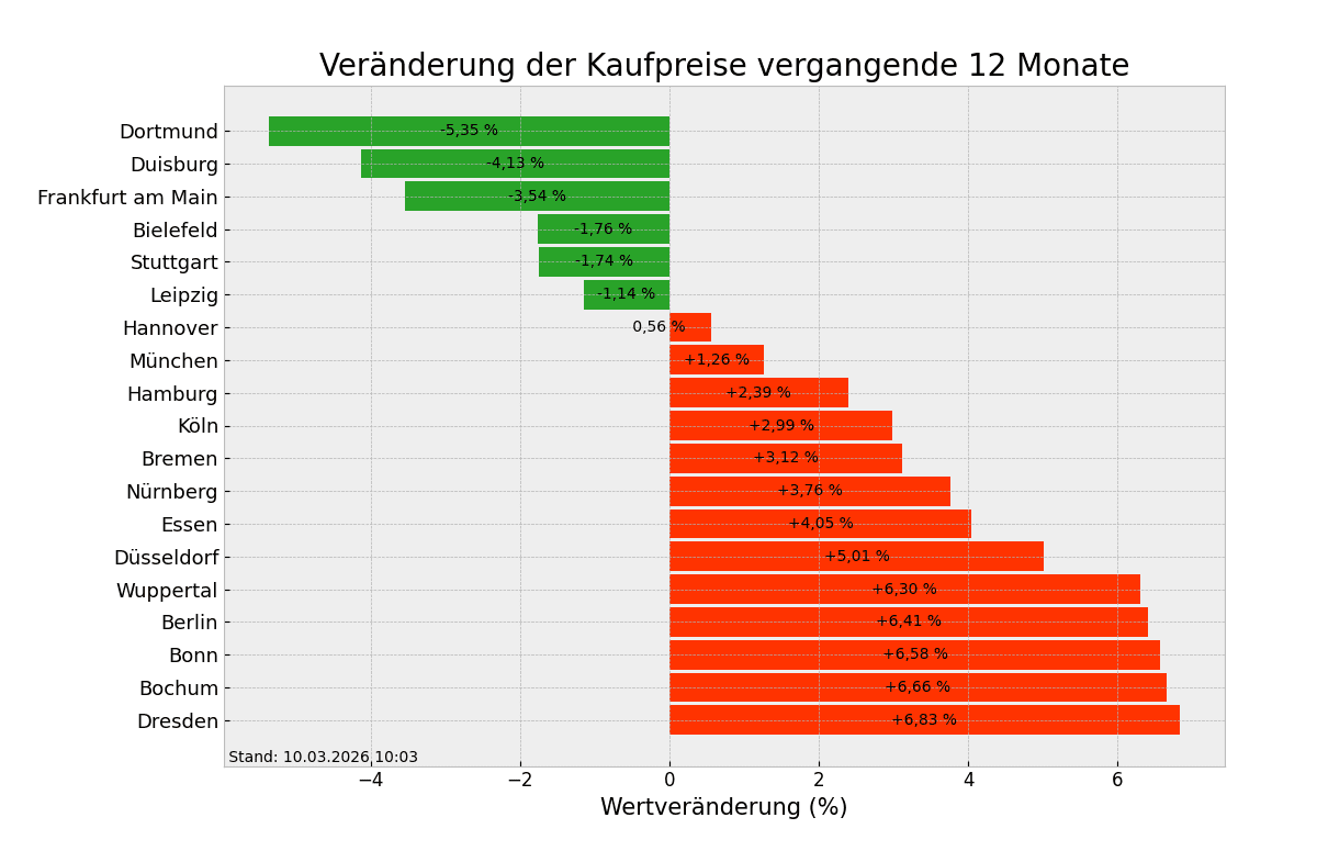 Um stolze 1,94 Prozent sind die Quadratmeterpreise seit der Vorjahreswoche geklettert, in immerhin 13 von 19 Städten. Einige Ausnahmen sind Dortmund, Duisburg und Frankfurt am Main, dort gaben die Preise leicht nach, jeweils um 3,54 bis 5,35 Prozent. Dresden, Bochum und Bonn stehen auf den Medaillenplätzen, wenn es um den Anstieg der Immobilienpreise geht. Ganz weit vorne ist Dresden mit aktuell 4062,73 Euro/m² (+6,83%), gefolgt von Bochum 2991,58 Euro/m² (+6,66%) und Bonn auf dem dritten Platz mit 4716,57 Euro/m² (+6,58%).