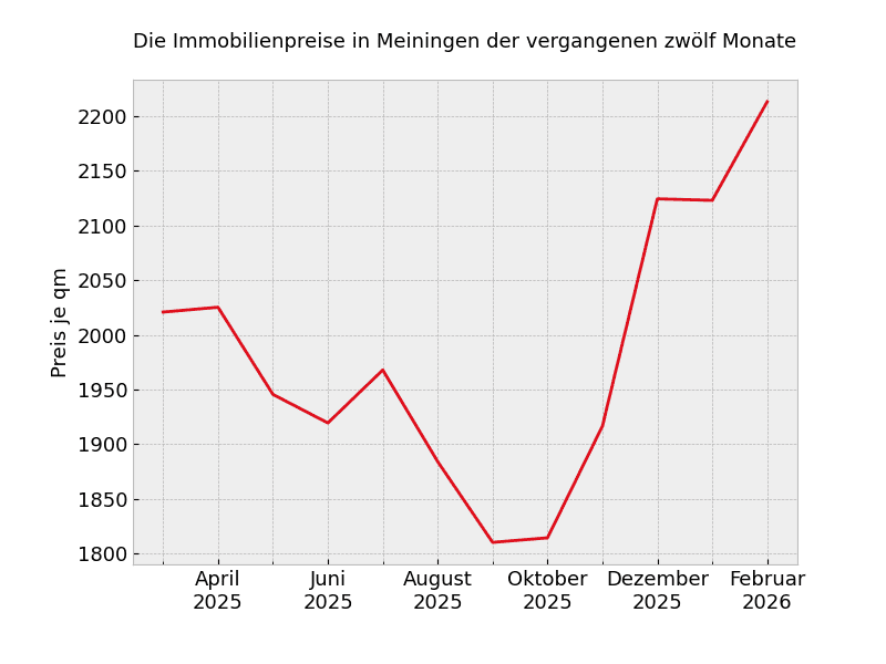 2.006 Euro: So viel kostet der Quadratmeter zur Zeit für Immobilien über alle Kategorien und Größen hinweg in Meiningen und damit 20,6 Prozent mehr als vor 12 Monaten.