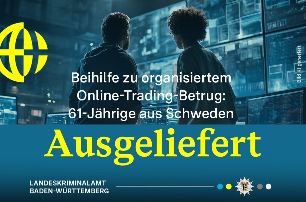 Das Cybercrime-Zentrum des Landeskriminalamts Baden-Württemberg hat die Auslieferung einer 61-jährigen Tatverdächtigen aus Schweden erwirkt. Der Frau wird mutmaßliche Beteiligung an organisiertem Online-Trading-Betrug vorgeworfen.