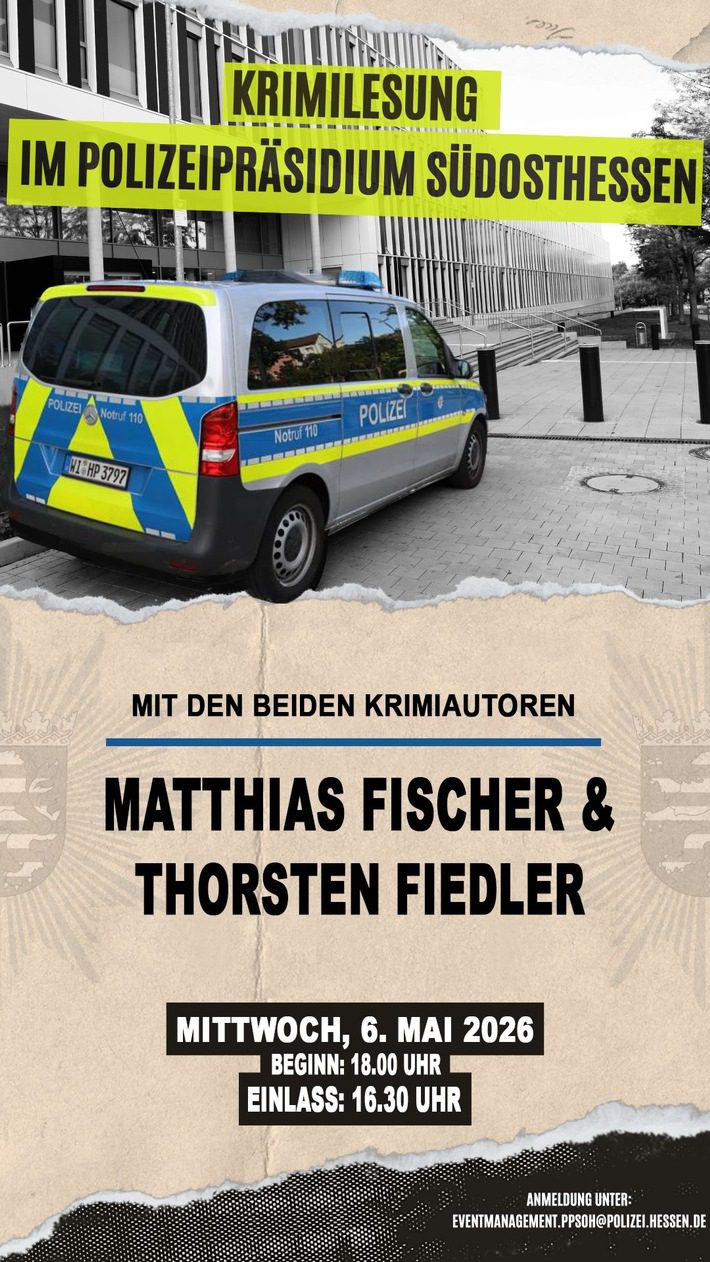 Der Einlass startet bereits um 16:30 Uhr. Die etwa zweistündige Lesung bietet den Besuchern anschließend die Möglichkeit zum persönlichen Austausch mit beiden Autoren. Aufgrund begrenzter Platzkapazitäten ist eine Anmeldung erforderlich – telefonisch unter 069 8098-1202 oder -1203 beziehungsweise per E-Mail an eventmanagement.ppsoh@polizei.hessen.de. Die Plätze werden nach Eingang der Anmeldungen vergeben.