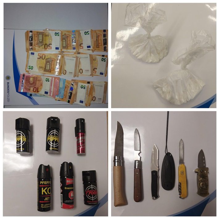 Ein 28-jähriger algerischer Staatsangehöriger wurde mit einem Einhandmesser und rund 100 Gramm vermutlich Kokain erwischt und vorläufig festgenommen. Gegen ihn bestehen zwei Fahndungstreffer wegen Eigentumsdelikten sowie der Verdacht des unerlaubten Aufenthalts. Er soll ebenfalls in die Untersuchungshaftanstalt gebracht werden.
