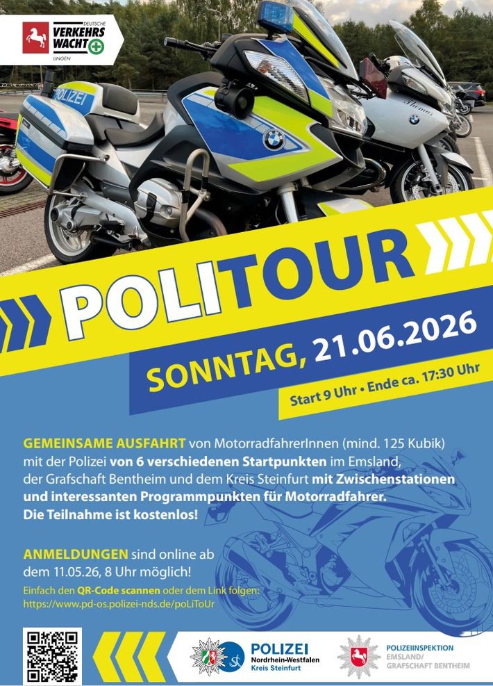 Am 21. Juni 2026 veranstalten die Polizeiinspektion Emsland/Grafschaft Bentheim, die Kreispolizeibehörde Steinfurt und die Verkehrswacht Lingen zum zweiten Mal gemeinsam die PoliTour – eine geführte Motorradtour, die Fahrerinnen und Fahrer für mehr Verkehrssicherheit sensibilisieren und ihre Fahrtechnik verbessern soll. Insgesamt 120 Teilnehmerinnen und Teilnehmer können mitmachen.