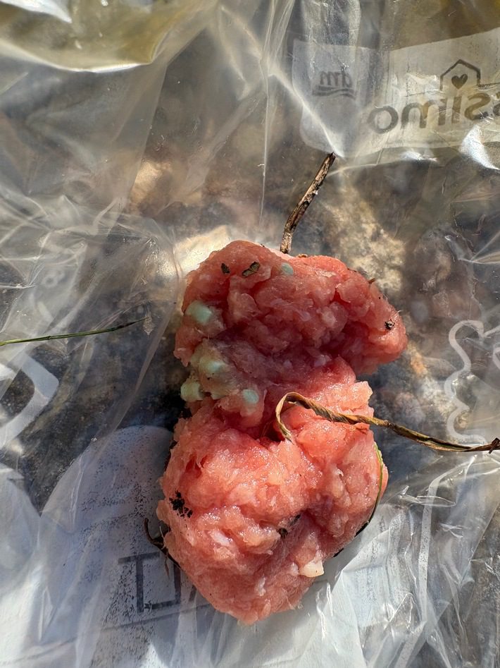 Die Polizisten stellten vor Ort mehrere Hackfleischbällchen mit grünlichen Körnern sicher. Nach Einschätzung der Ermittler lagen die verdächtigen Fleischbällchen weniger als zwölf Stunden an den Fundorten.